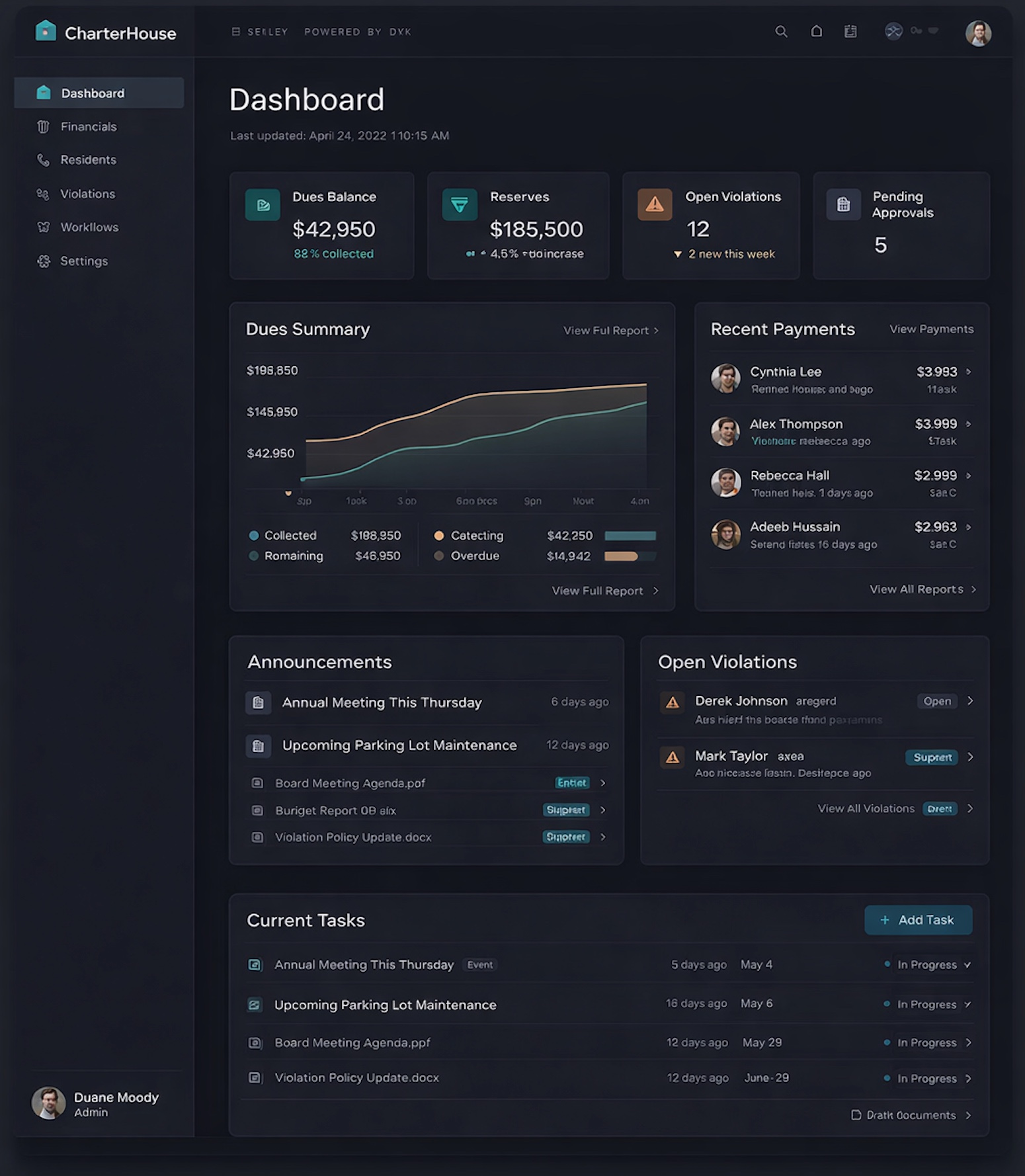 CharterHouse is designed as a unified system for financial operations, compliance workflows, and resident interaction. The platform emphasizes clarity, traceability, and simplicity across every function.